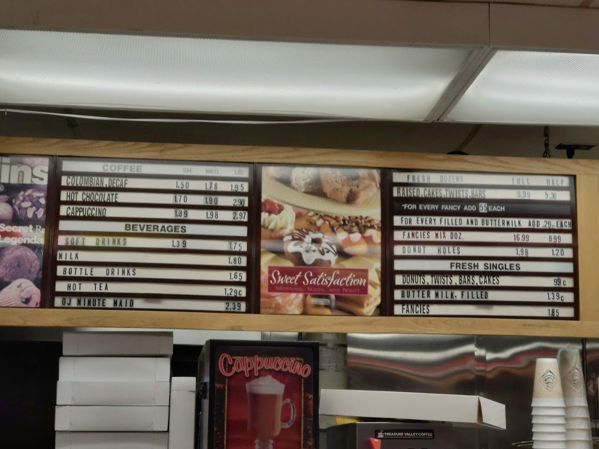 Beverages complementing the donuts include a variety of coffees such as Colombian and decaf options, cappuccinos, hot chocolate, and hot tea. Cold beverage choices include soft drinks, bottled drinks, milk, and orange juice.
