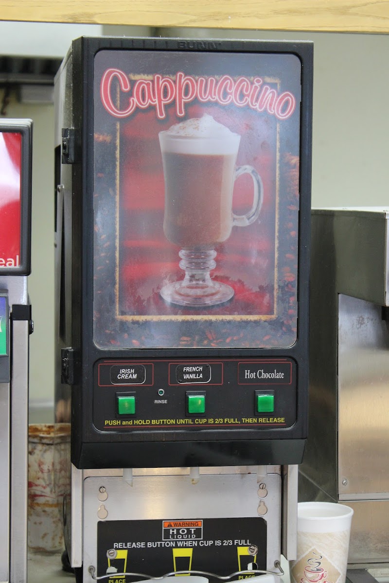 - Beverages: A selection of hot and cold drinks including coffee, cappuccino, hot chocolate, tea, soft drinks, milk, bottled beverages, and juice.